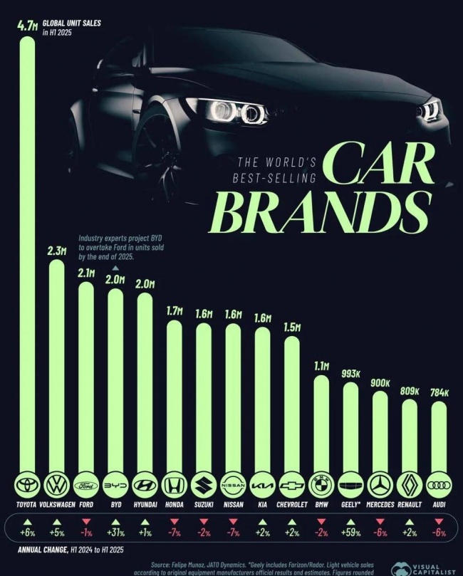 Самые продаваемые автомобильные бренды в мире — 2025