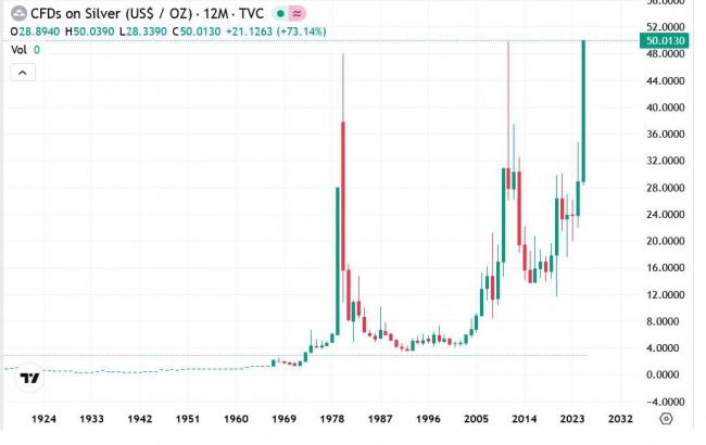 Исторический внутридневной максимум на биржах для серебра составлял $50,36 долларов и был достигнут в январе 1980 года. Это был пик на Нью-Йоркской товарной бирже COMEX. Однако серебро никогда не закрывало торговый день выше $50 долларов.