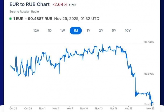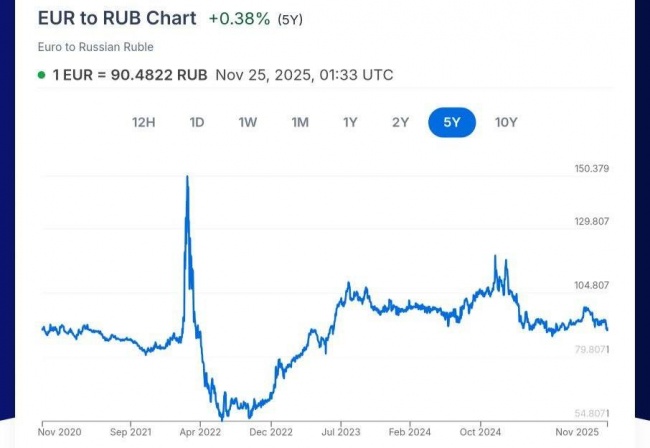 Рубль значительно укрепился с тех пор, как в СМИ была представлен мирный план из 28 пунктов. А итоге сейчас рубль торгуется по тому же курсу к евро, что и пять лет назад.