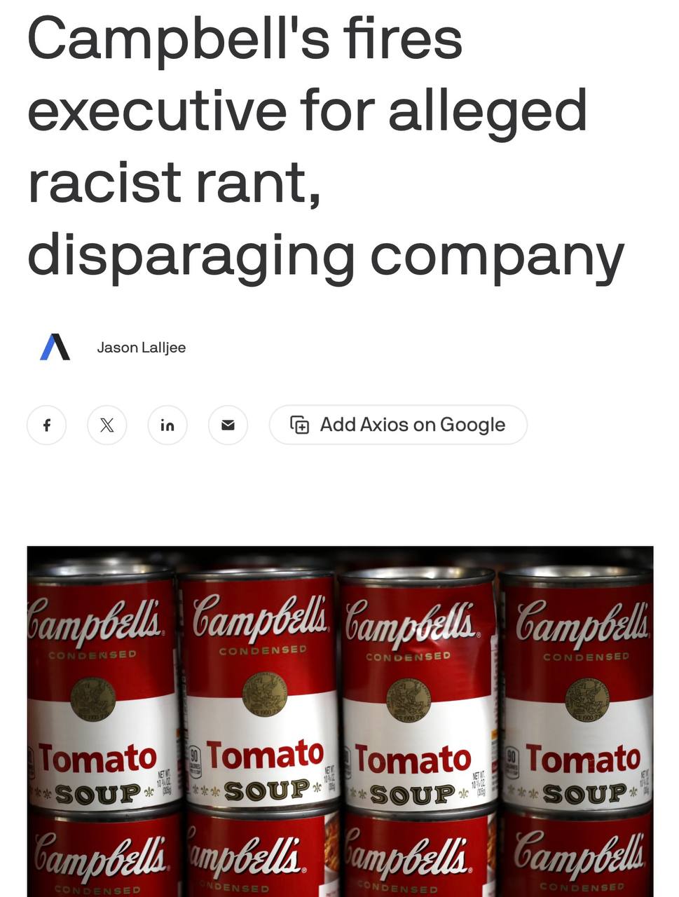 «Суп для нищих»: Campbell’s уволила вице-президента после скандальной аудиозаписи.