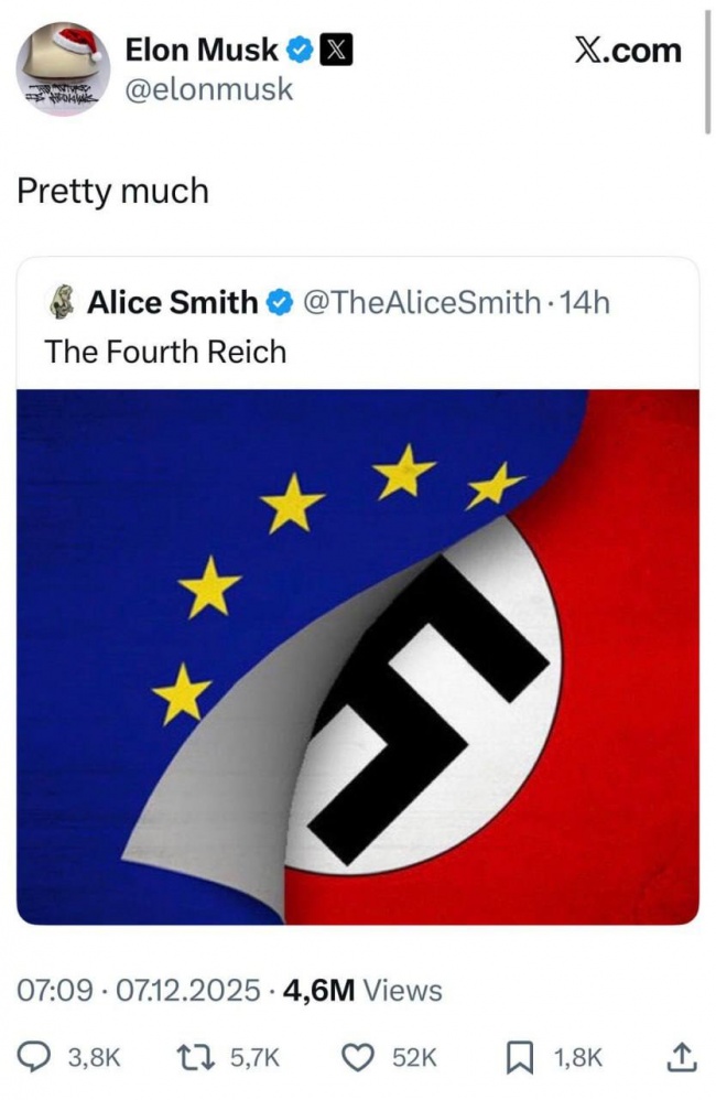 Так и есть, — Илон Маск ответил на пост, где Европу называют Четвертым Рейхом.