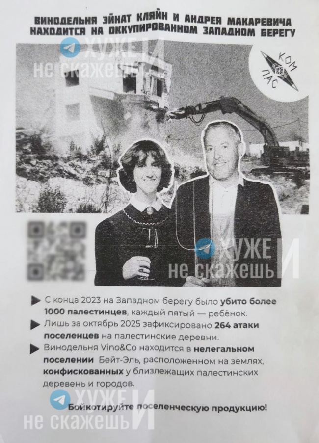 Активисты, выступающие в поддержку создания палестинского государства, уже распространили листовку с призывом к бойкоту «поселенческой продукции» Макаревича, так как его винодельня расположена в «нелегальном поселении на землях, конфискованных у близлежащих палестинских деревень».