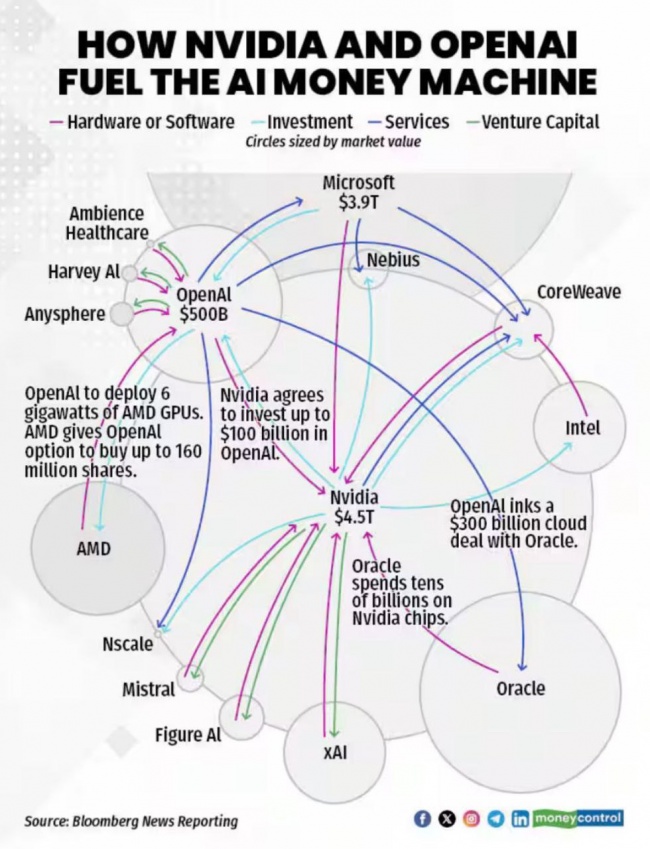 Партнёрство с OpenAI и покупка мощностей для ИИ у Oracle выглядят частью единой стратегии — создать монополию в области ИИ, которую будет невозможно обанкротить. Эти сделки приводят к огромному росту капитализации и повышению стоимости акций.