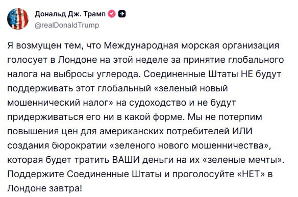 Трамп призвал проголосовать против введения глобального налога на выбросы углерода, который продвигает Международная морская организация.