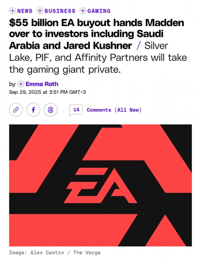 Саудовская Аравия за $55 млрд выкупила Electronic Arts — издателя Battlefield, Need for Speed, FIFA, The Sims и RPG от BioWare (Mass Effect, Dragon Age). Штаб-квартира EA останется в Калифорнии, а Королевство получает ключевой пакет франшиз, чтобы стать крупным игроком на рынке кибер-развлечений.