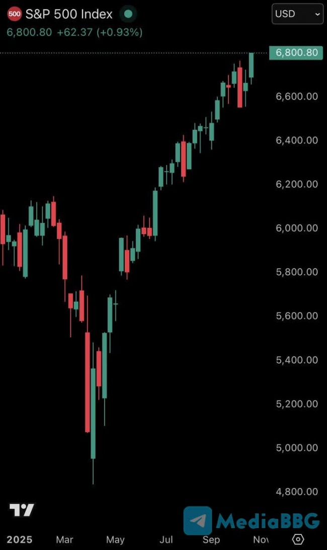 Индекс S&P 500 впервые в истории превысил отметку 6 800 пунктов, показав рост более чем на 40% с апрельского дна 2025 года.
