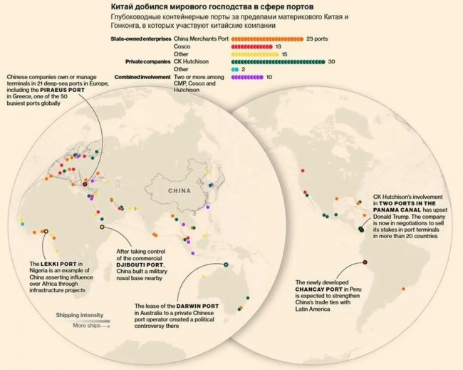 Пекин контролирует и может влиять на 90 ключевых глубоководных портов мира. В их число входят 34 из 100 самых загруженных портов по рейтингу Lloyd's List. У Китая пятый по величине контейнерный порт в Европе, первый глубоководный порт на тихоокеанском побережье Южной Америки, а также пакеты акций в более чем трети всех торговых портов Африки. Недовольство мощным развитием Китая высказал Трамп, Евросоюз провел операции против китайцев в крупнейшем порту Греции. В Европе не исключены новые национализации.