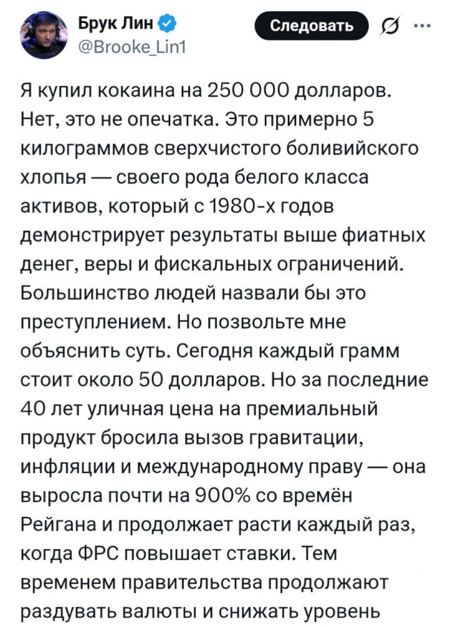 Инвестор рассказывает, что он вложил деньги в наркотики на фоне начала войны Трампа с Венесуэлой и Колумбией. Риски оказаться в тюрьме он почему-то не учитывает.