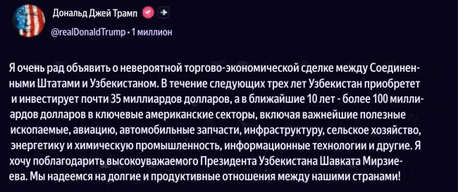 На этот раз поводом стало объявление Трампом (на скриншоте) о торговой сделке между США и Узбекистаном.