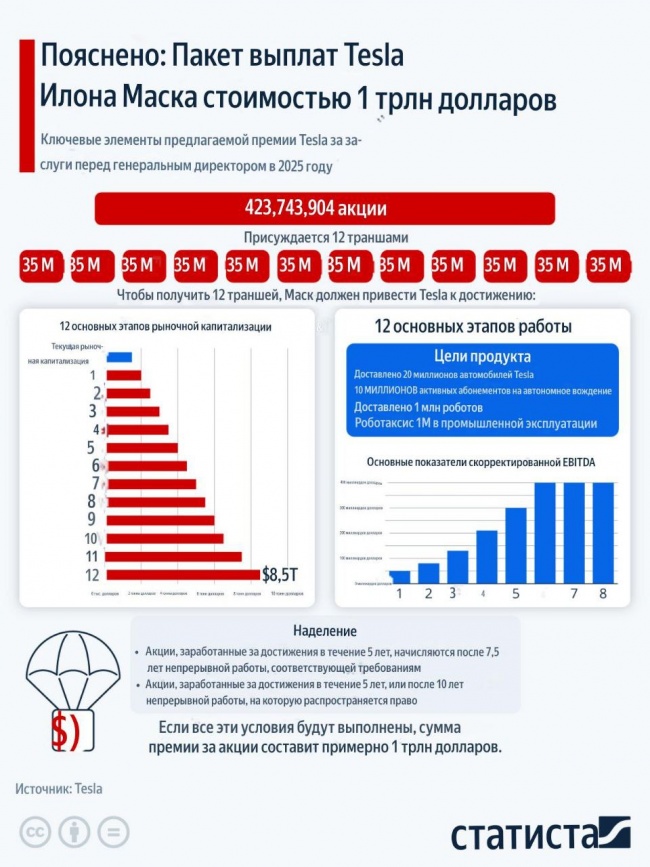 На графике предлагаемый план вознаграждения генерального директора Tesla Илона Маска, в рамках которого по достижении капитализации Tesla $8,5 триллиона Маск получит вознаграждение около триллиона долларов