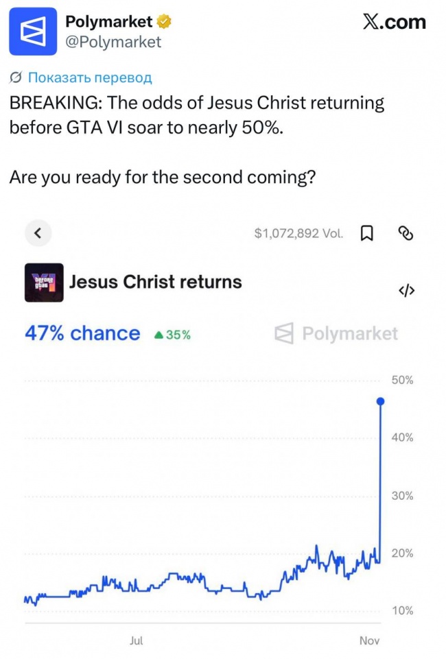 Букмекеры принимают ставки на то, что второе пришествие Христа будет раньше выхода GTA 6. Вероятность оценивается почти в 50%.