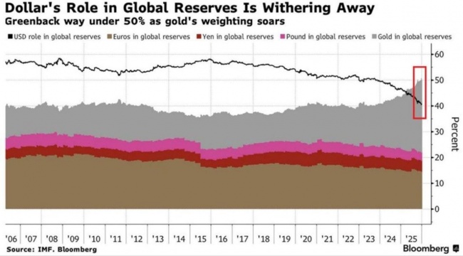 Американский доллар в настоящее время составляет ~40% мировых валютных резервов, что является самым низким показателем по крайней мере за последние 20 лет, упав на 18% за последние 10 лет