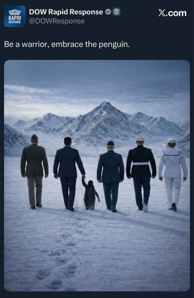 Белый дом и министерство войны США переселили пингвинов в Гренландию. Аккаунты ведомств запустили челлендж «Будь воином, обними пингвина». При этом эти птицы живут в Антарктике.