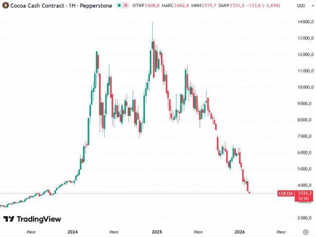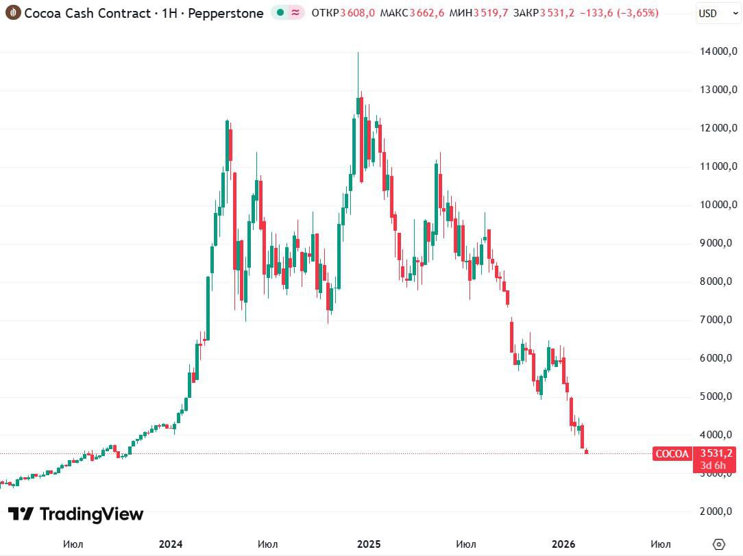 Шоколад уже скоро подешевеет. Фьючерсы на какао-бобы рухнули уже до $3500 за тонну. С пиков в декабре 2025 года цена обрушилась на 75%.