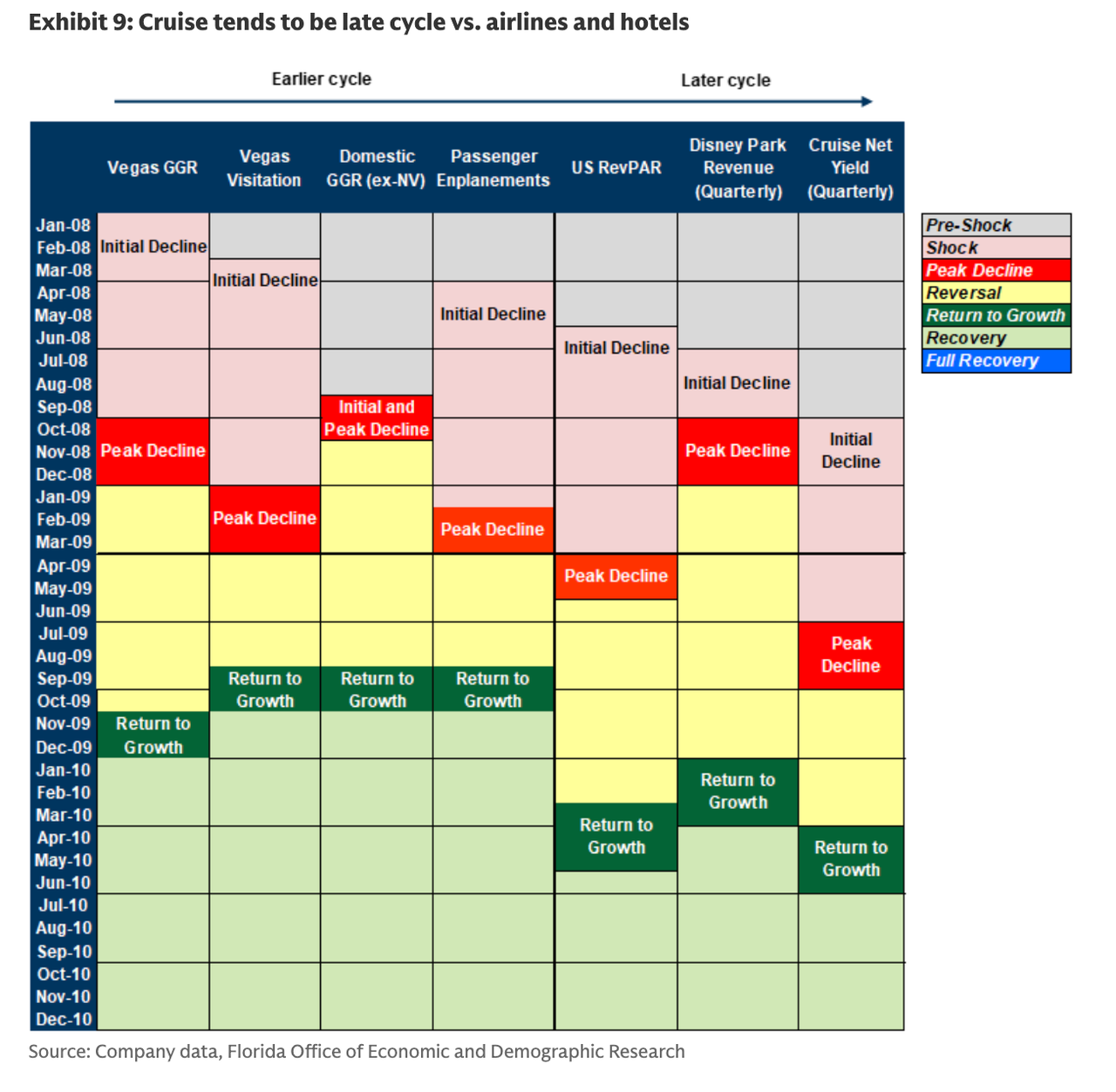 В середине заметки Dove о круизной индустрии спрятана инфографика, показывающая, что спад в круизной индустрии, как правило, происходит на поздних этапах цикла, тогда как откаты в игорном бизнесе, авиакомпаниях и отелях обычно происходят гораздо раньше — прямо перед тем, как цикл начинает идти на спад.